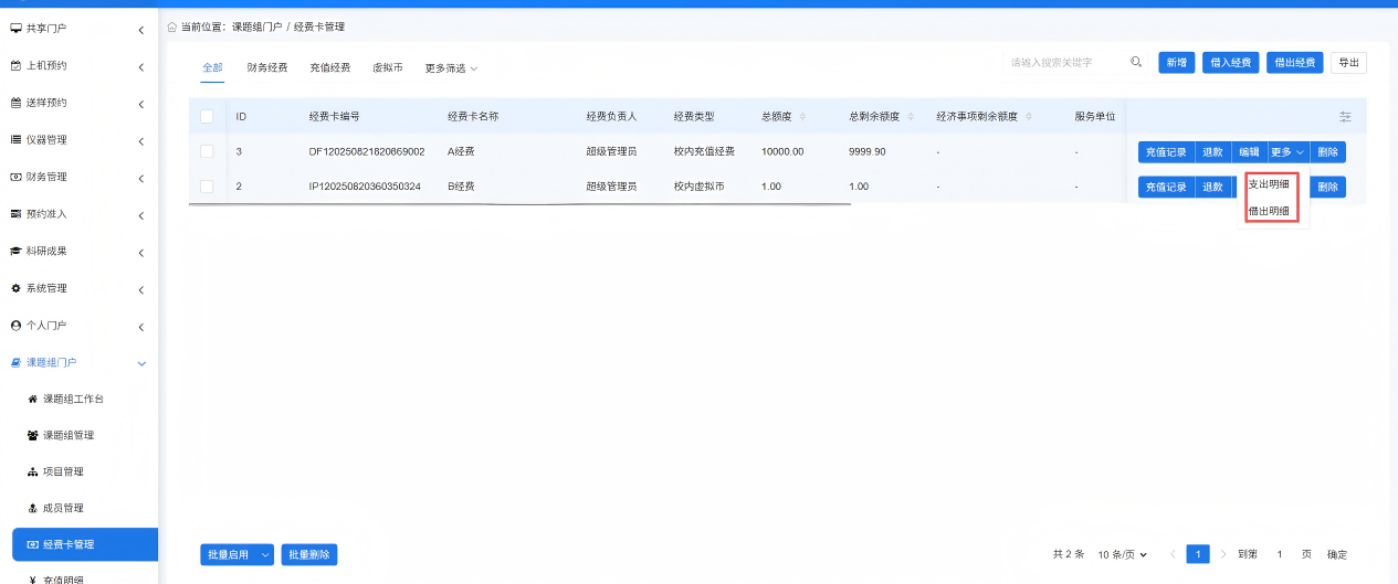 在【课题组门户-经费卡管理】页面,点击对应经费的“支出明细”可查看本课题组使用改经费的明细,点击“借出明细”可查看该经费在借出课题组的使用明细。