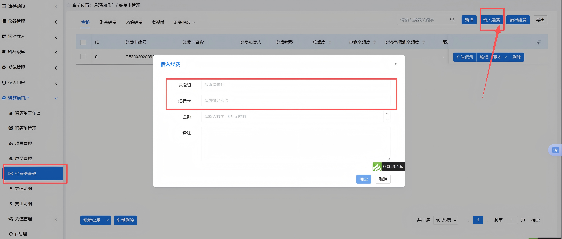 在【课题组门户-经费卡管理】页面,点击“借入经费”,选择课题组以及经费名称,点击“确定”按钮,待对方课题组审核通过后即可借入成功。