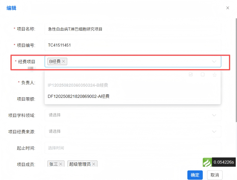 3.选择需要使用到的经费项目,并完善其他必填内容,点击“确定”按钮即可。