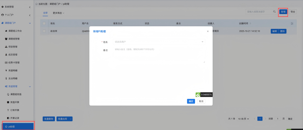 在【课题组门户-PI助理】页面,可以添加PI助理。