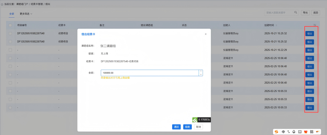 在【课题组门户-经费卡管理】页面,点击“借入经费”,即可审核其他课题组的借入经费申请。