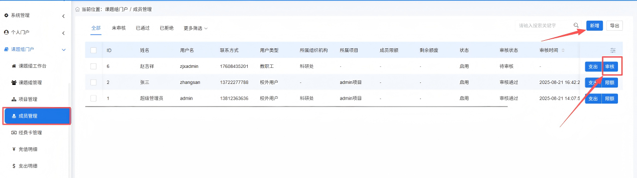 1.组内用户可主动申请加入课题组,课题组负责人在【课题组门户-成员管理】页面进行审核即可;