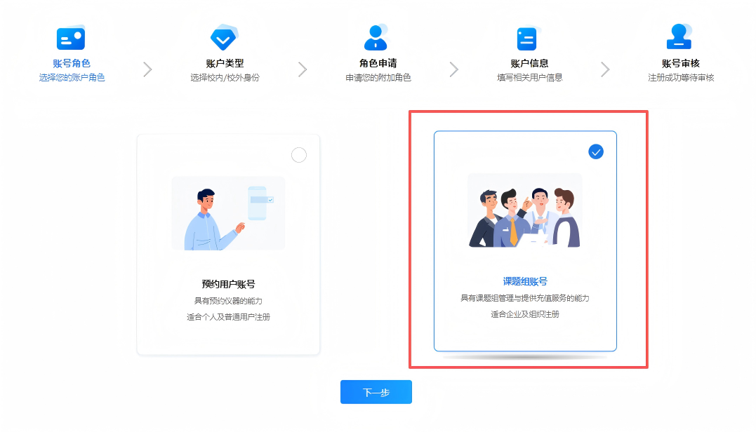 用户首次登录时,选择账户角色为“课题组账号”即可。